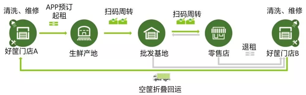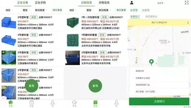 它的買賣和租賃服務(wù),主要面向塑料廠商和果蔬批發(fā)商。共享業(yè)務(wù)則由平臺(tái)投放折疊周轉(zhuǎn)筐,單個(gè)成本50元,有異地取還和同地取還等多種租賃方式,平均租金為每個(gè)筐每天2角,押金50元。