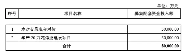 科迪乳業(yè)擬向不超過(guò) 10 名符合條件的特定投資者非公開(kāi)發(fā)行股份募集配套資金,本次募集配套資金總額不超過(guò)8億元。擬用于支付本次交易現(xiàn)金對(duì)價(jià)和年產(chǎn) 20 萬(wàn)噸烤腸建設(shè)項(xiàng)目。