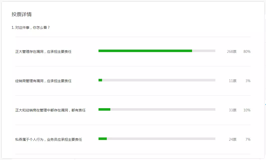 微信公眾號(hào)“凍品商”對(duì)此事件所做的一項(xiàng)調(diào)查顯示:參與投票的人中,認(rèn)為“南通正大管理存在漏洞,應(yīng)承擔(dān)主要責(zé)任”占投票總?cè)藬?shù)的80%;認(rèn)為“南通正大和經(jīng)銷商在管理中都存在漏洞,都有責(zé)任”的占10%,居第二位;認(rèn)為“私吞屬于個(gè)人行為,業(yè)務(wù)員應(yīng)承擔(dān)主要責(zé)任”的占7%;認(rèn)為“經(jīng)銷商管理有漏洞,應(yīng)承擔(dān)主要責(zé)任”占比僅為3%。