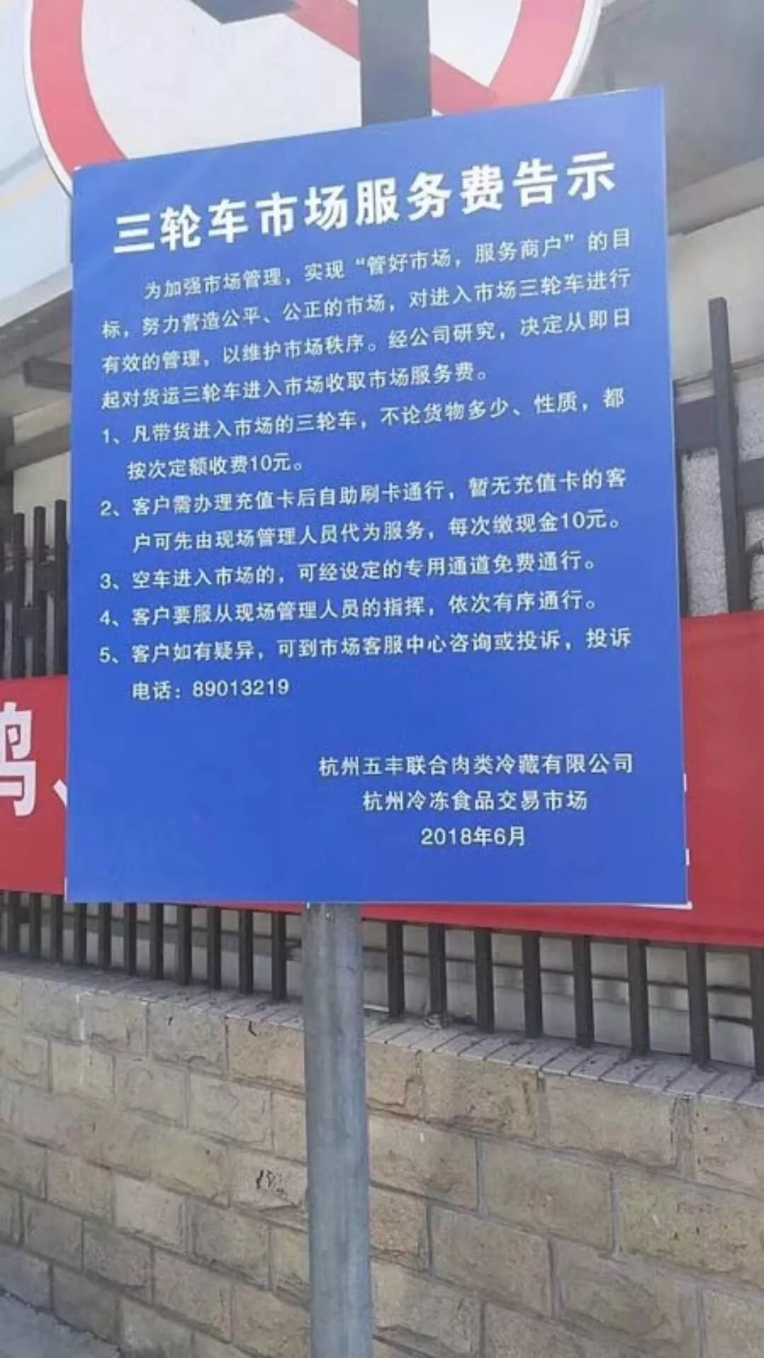 6月初,杭州五豐聯(lián)合肉類冷藏有限公司、杭州冷凍食品交易市場的一則“三輪車市場服務(wù)費”告示讓在經(jīng)銷商群體中引起了軒然大波!原本忙于經(jīng)營的經(jīng)銷商們慌了神:按照告示上的收費標(biāo)準(zhǔn),三輪車進(jìn)一次收費10元,生意好的時候一天要進(jìn)上百次,真的要一天給市場交1000元“三輪車市場服務(wù)費”嗎?