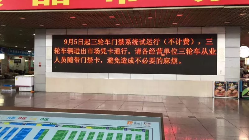 小冰了解發(fā)現(xiàn),原由是市場(chǎng)發(fā)布的一則通知:9月5日起,三輪車(chē)門(mén)禁系統(tǒng)試運(yùn)行(不計(jì)費(fèi)),三輪車(chē)進(jìn)出市場(chǎng)憑卡通行。