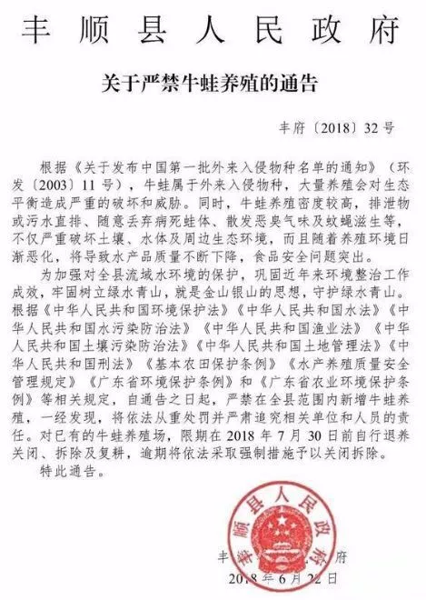 根據(jù)《關(guān)于發(fā)布中國(guó)第一批外來入侵物種名單的通知》(環(huán)發(fā)〔2003〕11號(hào)),牛蛙屬于外來入侵物種,大量養(yǎng)殖牛蛙會(huì)對(duì)生態(tài)平衡造成較大的破壞和威脅。同時(shí),牛蛙養(yǎng)殖污水直排、隨意丟棄病死蛙體、散發(fā)惡臭氣味及蚊蠅滋生等,不僅嚴(yán)重破壞土壤、水體及周邊生態(tài)環(huán)境,而且隨著養(yǎng)殖環(huán)境日漸惡化,將導(dǎo)致水產(chǎn)品質(zhì)量不斷下降,食品安全問題突出。