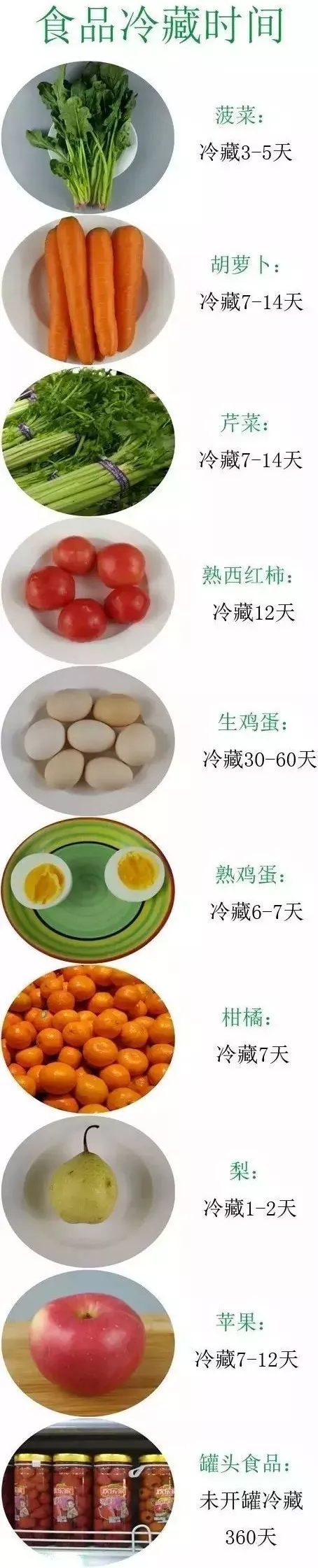 經過上圖展示我們可以看出,一般果蔬類,蛋類以及奶類食物冷藏期都比較短,少則1~2天,多則7~14天,所以買來之后應盡快食用。經過高溫殺菌處理過的罐頭類食品一般保存時間較長,可達360天,像雞肉、牛肉、肉排、魚類等肉制品冷藏期普遍較短,但冷凍條件下都比較穩(wěn)定,保存時間甚至能長達360天。