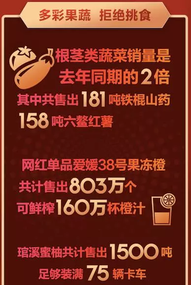 在果蔬單品銷售榜中,VC滿滿的網(wǎng)紅單品愛媛38果凍橙占據(jù)了C位,共計(jì)賣出803萬個(gè),可鮮榨160萬杯500ml的橙汁;同樣富含VC的知名“網(wǎng)紅”琯溪蜜柚共計(jì)售出1500噸,足夠裝滿75輛卡車;代表著健康的根莖類蔬菜同樣銷量不俗,181噸鐵棍山藥,158噸六鰲紅薯被搶購(gòu)一空。