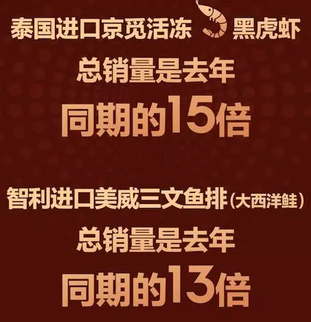 其中,泰國(guó)海產(chǎn)總銷量是去年同期6倍;智利共計(jì)售出56噸海鮮水產(chǎn),是去年同期的5倍;挪威海產(chǎn)銷量達(dá)30000件,其中僅三文魚便占到了總銷量的30%;加拿大大龍蝦共計(jì)賣出12噸,頭尾相連可繞天安門廣場(chǎng)三圈;自營(yíng)法國(guó)生蠔銷量是去年同期的15倍……