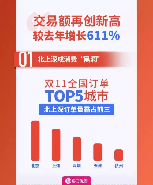每日優(yōu)鮮報(bào)告顯示,今年雙十一,北上深三地的訂單占比持續(xù)霸占全國前三甲位置,排在第四、五位的分別為天津和杭州。