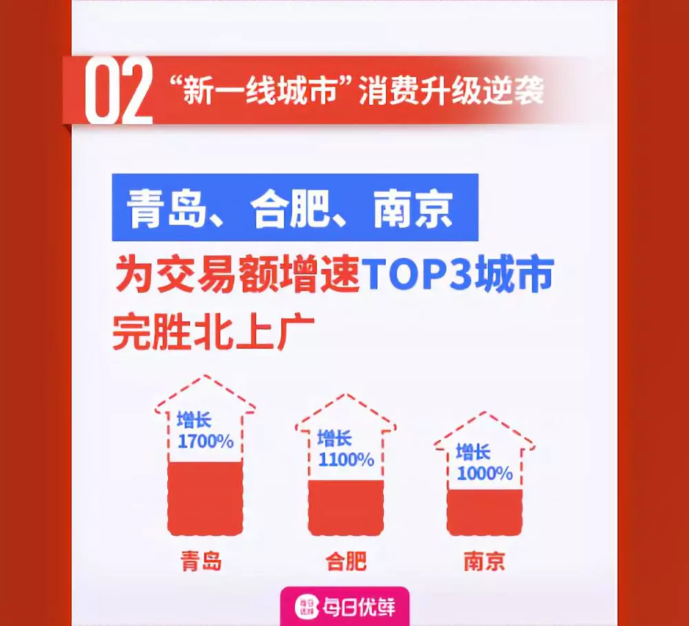 數(shù)據(jù)報(bào)告稱,以青島為代表的“新一線城市”生鮮消費(fèi)實(shí)力驚人。與去年同期相比,青島、合肥、南京交易額同比增速位列全國前三,實(shí)現(xiàn)消費(fèi)升級(jí)逆襲,超過北上廣。