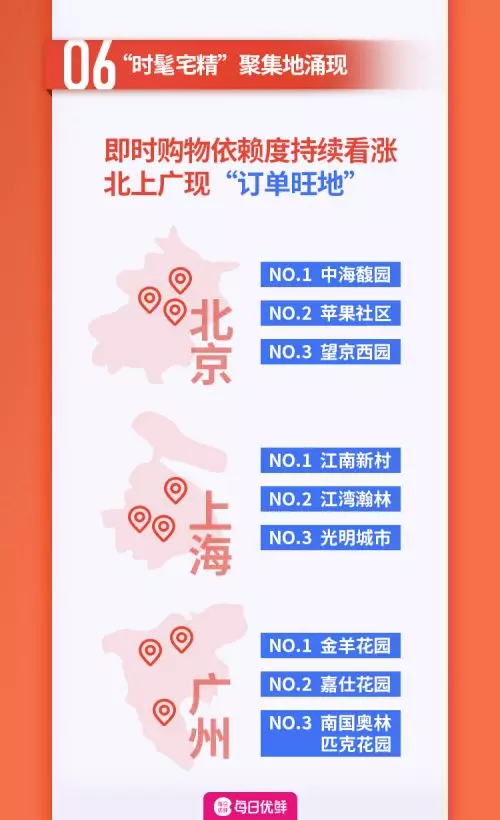 從每日優(yōu)鮮公開的數(shù)據(jù)來看,北京的中海馥園、蘋果社區(qū)、望京西園以及上海的江南新村、江灣瀚林、光明城市, 廣州的金羊花園、嘉仕花園、南國奧林匹克花園正在成為“訂單旺地”,這些區(qū)域的消費(fèi)者對(duì)即時(shí)購物的依賴度也越來越高。