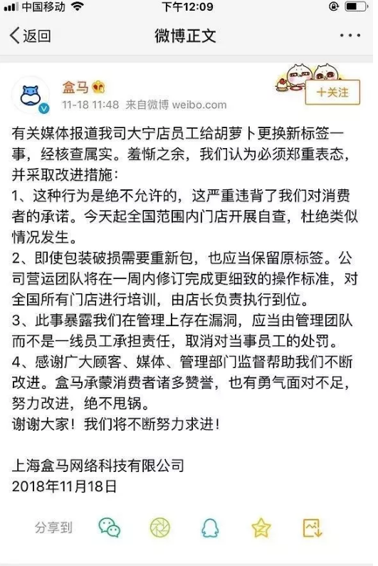 此外,11月18日,盒馬鮮生通過(guò)官方微博回應(yīng)稱,該事件經(jīng)核查屬實(shí)。即使包裝破損需要重新包,也應(yīng)當(dāng)保留原標(biāo)簽,公司營(yíng)運(yùn)團(tuán)隊(duì)將在一周內(nèi)修訂完成更細(xì)致的操作標(biāo)準(zhǔn),對(duì)全國(guó)所有門店進(jìn)行培訓(xùn),由店長(zhǎng)負(fù)責(zé)執(zhí)行到位。該事件暴露了管理的漏洞,應(yīng)由管理團(tuán)隊(duì)而非一線員工承擔(dān)責(zé)任,取消對(duì)當(dāng)事員工的處罰。