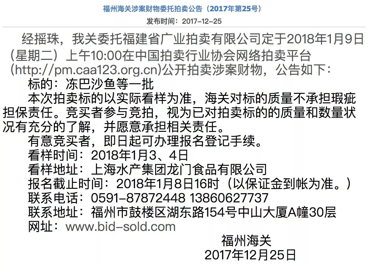 此次拍賣全程在網(wǎng)上進(jìn)行,由福建廣業(yè)拍賣有限公司在中國拍賣行業(yè)協(xié)會(huì)網(wǎng)絡(luò)拍賣平臺(tái)具體執(zhí)行,拍賣公告于12月25日由福建海關(guān)發(fā)布,看樣時(shí)間已經(jīng)在2018年1月3日和4日完成,拍賣產(chǎn)品全部儲(chǔ)存在上海水產(chǎn)集團(tuán)龍門食品有限公司的倉庫中。