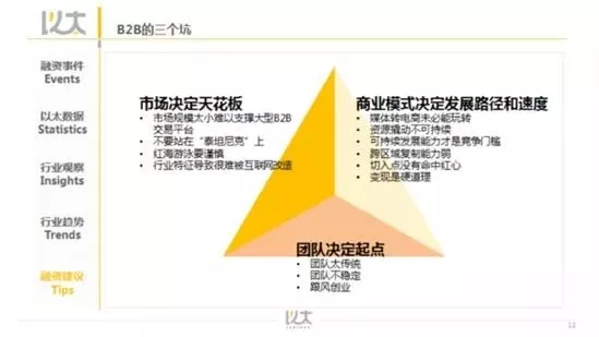 以太投資團(tuán)隊(duì)曾經(jīng)從3個(gè)維度,對(duì)B2B平臺(tái)通常面臨的問(wèn)題(也就是常見的“坑”)做了總結(jié),分別是市場(chǎng)/方向、團(tuán)隊(duì)和商業(yè)模式。他們認(rèn)為,B2B所在的市場(chǎng)決定了發(fā)展的天花板,團(tuán)隊(duì)決定了起點(diǎn),而商業(yè)模式?jīng)Q定了平臺(tái)發(fā)展的路徑和速度。這也是B2B平臺(tái)在尋求投資的過(guò)程中,最為投資人所看重的三個(gè)方面。