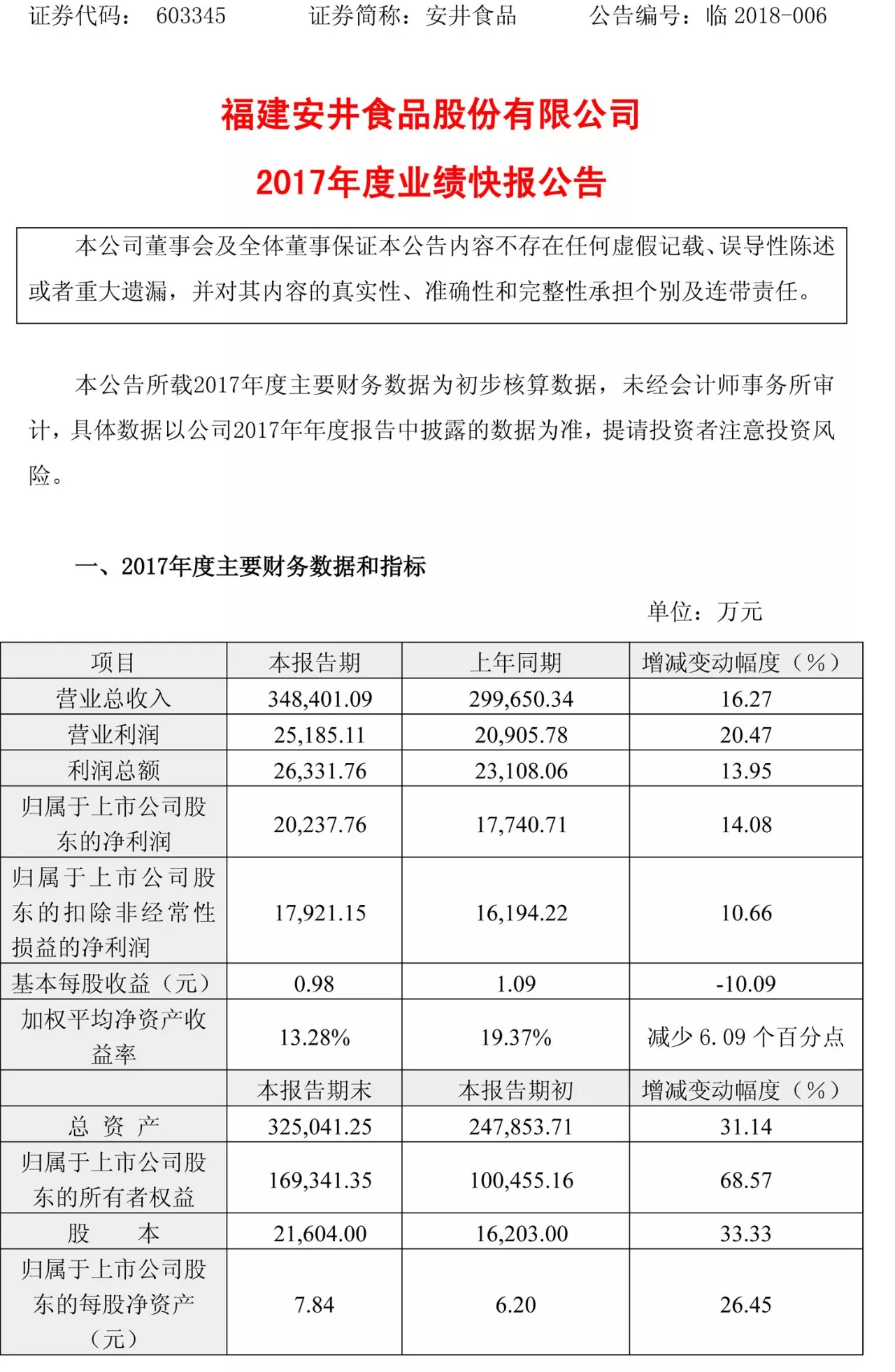 公告顯示2017年,安井食品實現(xiàn)營業(yè)收入34.8億元,同比增長16.27%,實現(xiàn)利潤總額2.63億元,同比增長13.95%;歸屬于上市公司股東的凈利潤2.02億元,同比增長14.08%。