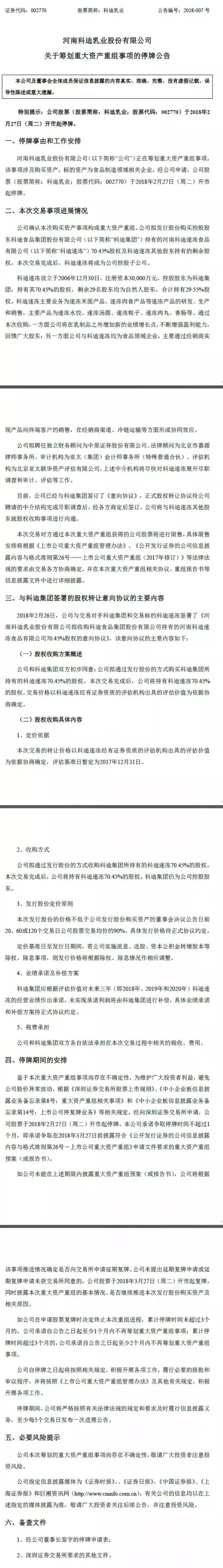 來源: 投實(shí) 發(fā)布者:編輯2月26日,科迪乳業(yè)發(fā)布關(guān)于籌劃重大資產(chǎn)重組事項(xiàng)的停牌公告,公司正在籌劃重大資產(chǎn)重組事項(xiàng),該事項(xiàng)涉及購買資產(chǎn),標(biāo)的資產(chǎn)為食品制造領(lǐng)域相關(guān)企業(yè)。