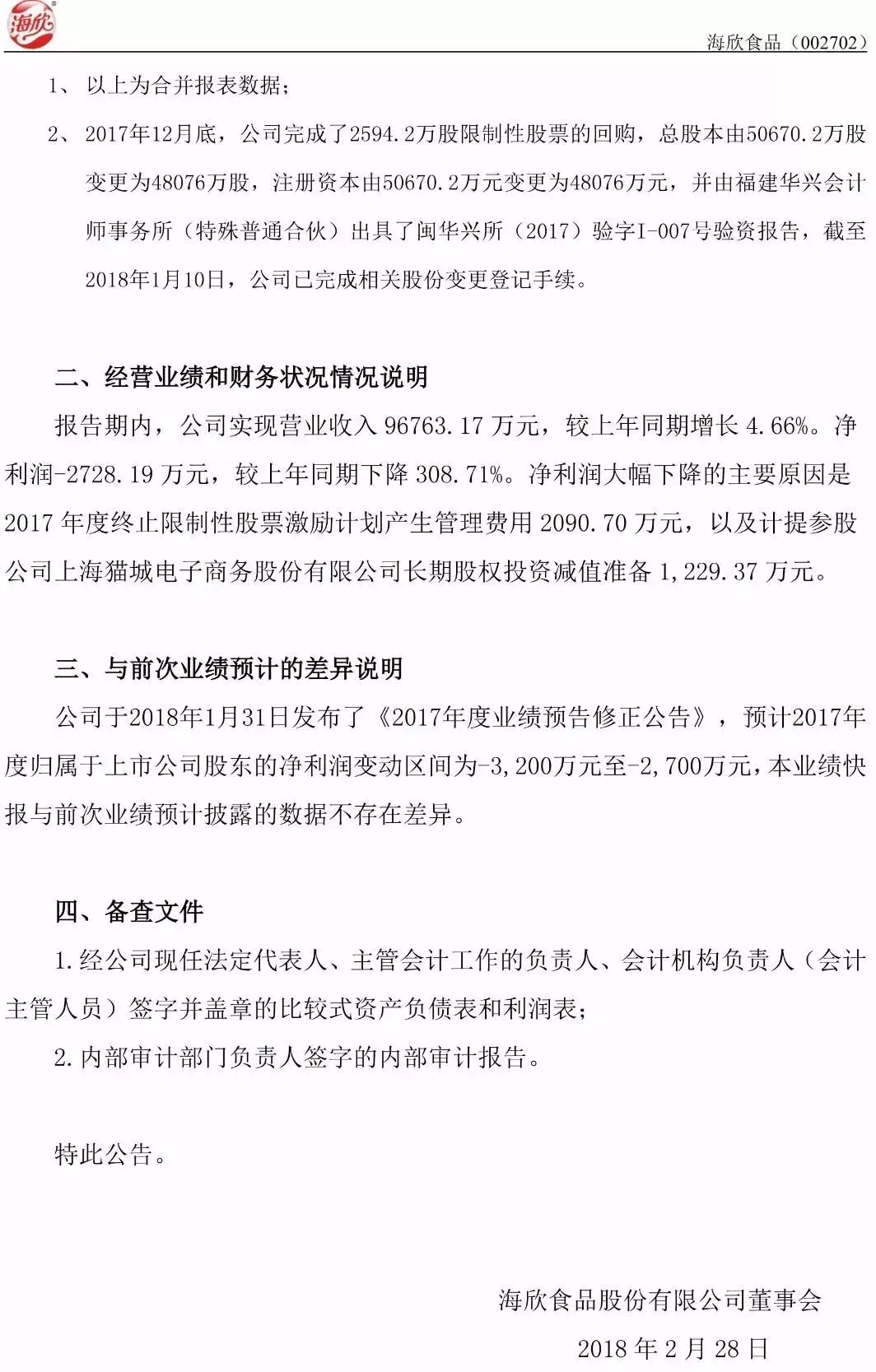 2月28日,海欣食品股份有限公司發(fā)布2017年度業(yè)績快報,經(jīng)初步核算,報告期內(nèi),公司實現(xiàn)營業(yè)收入96763.17萬元,較上年同期增長4.66%,營業(yè)利潤2814.49萬元,較上年同期下降292%。歸屬上市公司股東的凈利潤-2728.19萬元,較上年同期下降308.71%。