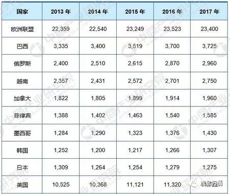 2013-2017年全球生豬出欄量分國家統(tǒng)計(千頭)
