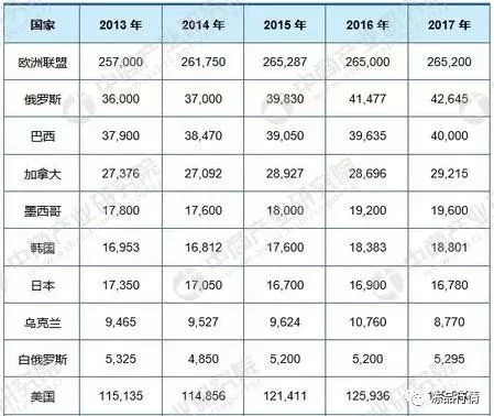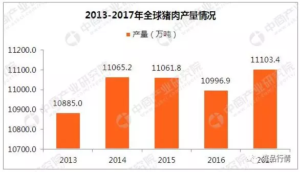 2013-2017年全球豬肉產(chǎn)量分國家統(tǒng)計表(千噸)