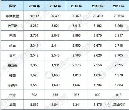 2013-2017年全球生豬存欄量分國家統(tǒng)計(千頭)