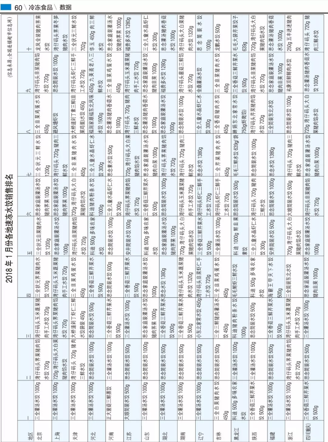 備注:該排名由全國連鎖超市信息網(wǎng)提供,數(shù)據(jù)來源于全國300多家大中小型超市系統(tǒng)的近2000家門店的冷凍食品銷量,不包含百貨商場及其他小店。各省份門店樣本數(shù)量不盡一致,排名情況,僅供參考。