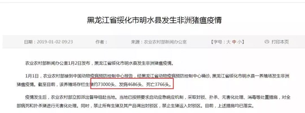 就在大家以為疫情趨緩之時(shí),元旦過(guò)后第一天,2019年1月2日上午9點(diǎn)半,農(nóng)業(yè)部發(fā)布了黑龍江省綏化市明水縣發(fā)生非洲豬瘟疫情,該養(yǎng)殖場(chǎng)存欄生豬約73000頭、發(fā)病4686頭、死亡3766頭。