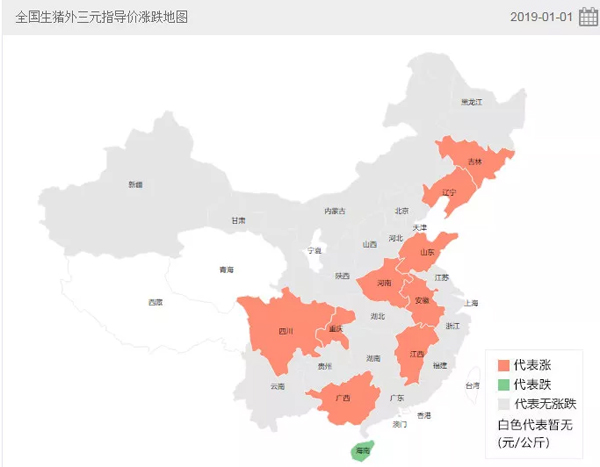 △豬e網(wǎng)統(tǒng)計(jì)的2019年1月1日全國(guó)生豬外三元指導(dǎo)價(jià)漲跌地圖