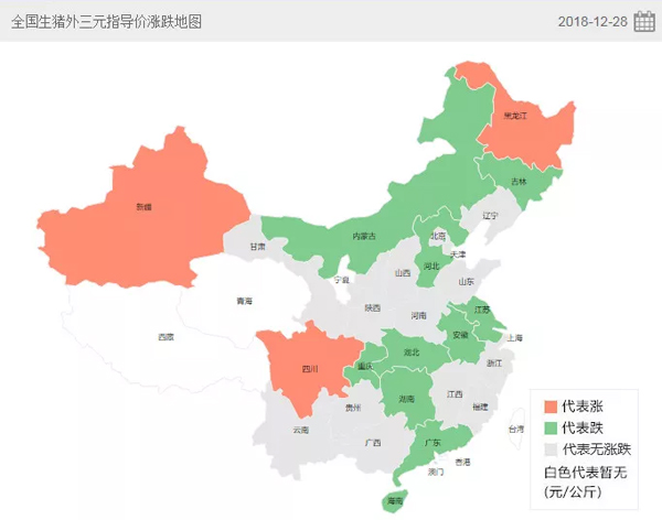 △豬e網(wǎng)統(tǒng)計(jì)的2018年12月28日全國(guó)生豬外三元指導(dǎo)價(jià)漲跌地圖
