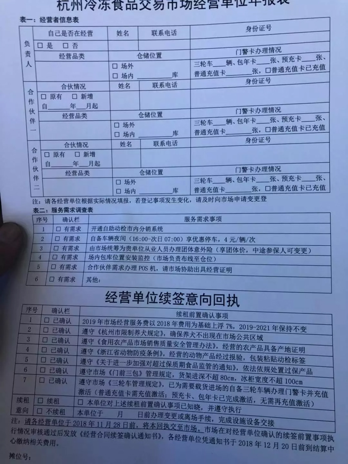“每年最后一次攤位費(fèi)和冷庫費(fèi)一起算,經(jīng)營單位續(xù)簽意向回執(zhí)一欄中七個確認(rèn)欄必須全部同意才給交費(fèi),不同意就不能續(xù)簽。”商戶張某說。
