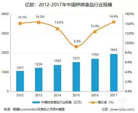 有大數(shù)據(jù)為證。2012—2017年,五年間,我國(guó)烘焙產(chǎn)品的銷(xiāo)售額已由1071.02億元增長(zhǎng)到1944.79億元。