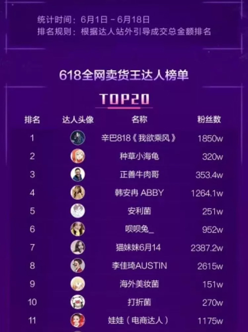 從618根據(jù)GMV(網(wǎng)站成交金額)排名的全網(wǎng)賣貨王達(dá)人榜單上可以看出,電商平臺(tái)上,粉絲量與銷售能力并不完全成正比。