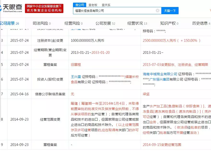 變更經(jīng)營范圍不到一年時間,2015年7月24日,長恒食品投資人(股權(quán))就由王興星變更為廣東恒興集團有限公司和海南中城商業(yè)有限公司。