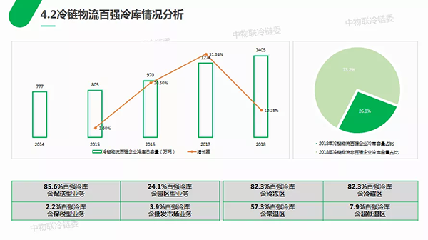冷鏈物流百強(qiáng)企業(yè)冷庫資源方面顯示,2018年投入使用的冷庫共約1405萬噸(折合3513萬立方米),較去年百強(qiáng)增長10.28%。百強(qiáng)企業(yè)冷庫總量約可占到總?cè)萘康?6.8%,與往年百強(qiáng)冷庫容量占比基本持平。截至2018年年底,我國冷庫總量達(dá)到5238萬噸(折合1.3億立方米)。