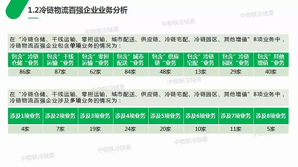 2018年冷鏈物流百強(qiáng)企業(yè)中業(yè)務(wù)著重布局的前三名分別是:干線運(yùn)輸、冷鏈倉儲(chǔ)、城市配送,開展冷鏈宅配、冷鏈園區(qū)業(yè)務(wù)的百強(qiáng)企業(yè)較少。同時(shí),可以看出當(dāng)前單一業(yè)務(wù)類型的冷鏈物流企業(yè)數(shù)量極少,大部分冷鏈物流企業(yè)涉及3-5項(xiàng)業(yè)務(wù),涉及業(yè)務(wù)類型多元,紛紛向綜合冷鏈物流服務(wù)企業(yè)轉(zhuǎn)型,未來冷鏈物流發(fā)展將向供應(yīng)鏈方向邁進(jìn)。