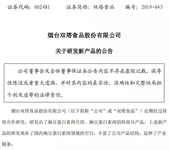 9月4日,一家上市公司的公告完美地蹭上了中秋節(jié)的熱點(diǎn)。雙塔食品(002481.SZ)發(fā)布公告稱公司成功研發(fā)出了豌豆蛋白素肉月餅、豌豆蛋白素肉餡料部分產(chǎn)品,填補(bǔ)了國(guó)內(nèi)豌豆蛋白素肉領(lǐng)域的空白。