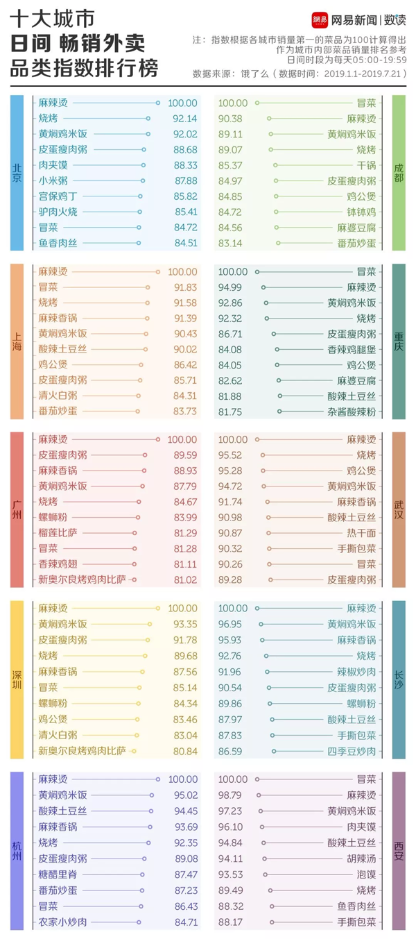 近日,網(wǎng)易數(shù)讀根據(jù)餓了么提供的數(shù)據(jù),統(tǒng)計了北京、上海、廣州、深圳、杭州、成都、重慶、西安、長沙、武漢10座城市的外賣排行榜,找到了稱霸中國外賣市場的那個它。