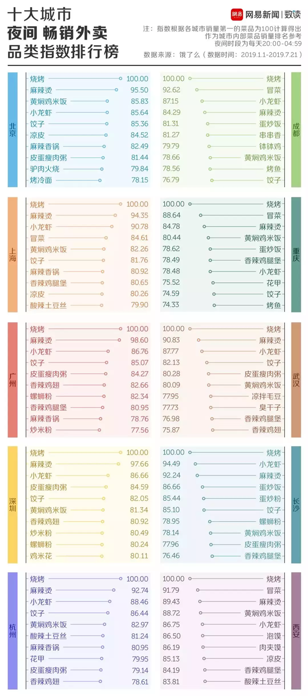 燒烤用橫掃十座城市外賣榜單的表現(xiàn)向我們證明,夜宵的江湖屬于燒烤。