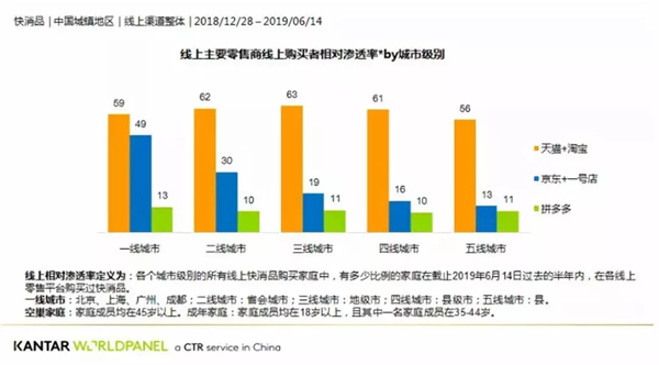 據(jù)凱度消費者指數(shù)消息,就快消品的線上購買者滲透率而言,在截止2019年6月過去的半年期間,一線城市(北京、上海、廣州、成都)中已有13%的家庭在拼多多購買過快消品,這個數(shù)字高于拼多多在二至五線城市的線上購買者相對滲透率。