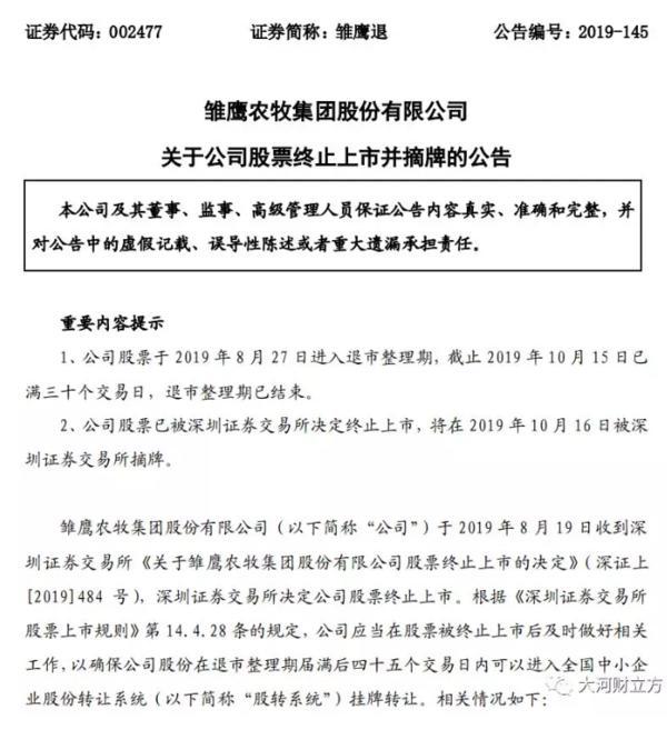 剛剛!雛鷹農(nóng)牧集團(tuán)股份有限公司(以下簡稱雛鷹農(nóng)牧)發(fā)布公告,宣告其股票已被深交所決定終止上市,將在2019年10月16日被深交所摘牌。