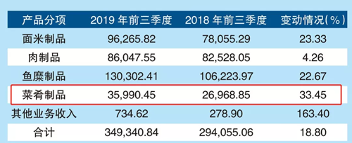對(duì)此,安井食品補(bǔ)充稱,2019年前三季度菜肴制品同比增長(zhǎng)33.45%,主要是蛋餃、千夜豆腐系列產(chǎn)品收入增長(zhǎng)所致。