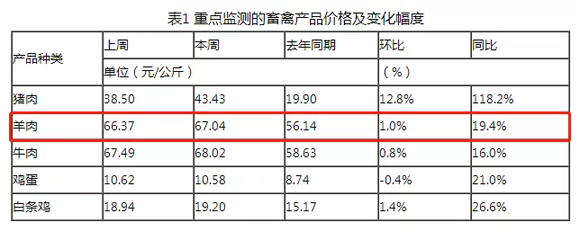 數(shù)據(jù)還顯示,截至上周,國內(nèi)牛、羊肉批發(fā)價(jià)格分別在67.49元/公斤、66.37元/公斤,去年羊肉批發(fā)價(jià)格高點(diǎn)在60元/公斤左右。