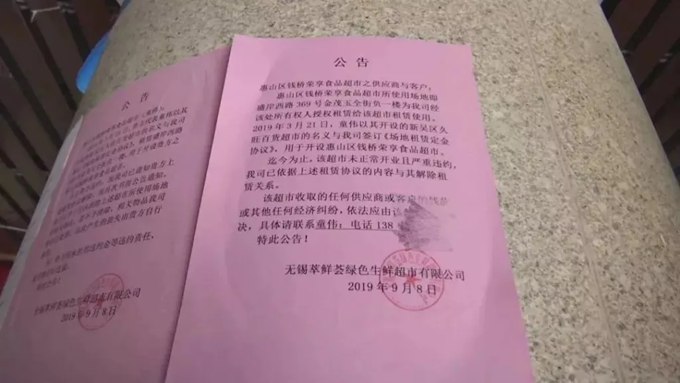 在超市外面的柱子上,貼了三張公告和一張溫馨提示, 租戶(hù)們講,他們事后了解到,租給他們攤位的實(shí)際上是二房東童先生,超市的租金、水電費(fèi)等他也沒(méi)有跟大房東結(jié)清 。