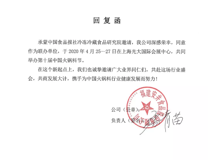 應(yīng)中國食品報社冷凍冷藏食品研究院/第十屆中國火鍋料節(jié)組委會邀請,安井、三全快廚、海欣、惠發(fā)、海霸王、千味央廚、升隆、鴻津、佳士博、源香、福春園等組成“最強陣營”,成為2020年第十屆中國火鍋料節(jié)聯(lián)合承辦單位。