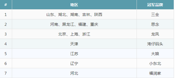 同之前獨(dú)攬8、9個(gè)第一相比,三全本月的業(yè)績略有下降,僅在5省獲得第一;思念食品緊隨其后,在4個(gè)省獲得第一,業(yè)績進(jìn)步明顯;龍鳳水餃后勢勁兒足,一舉拿下3省之冠;往月在北京、上海表現(xiàn)突出的灣仔碼頭,11月僅在天津一地奪冠;有趣的是,河北地區(qū)冒出個(gè)新冠軍——“福潤家順福東北風(fēng)味水餃”。