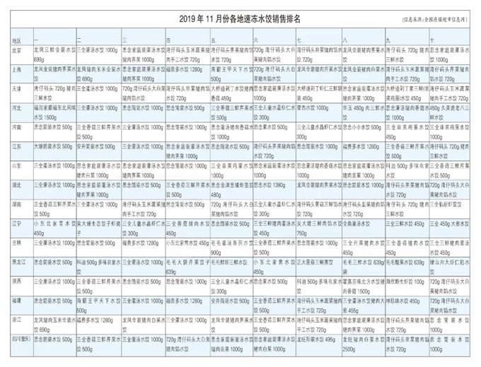 來源: 冷凍食品網(wǎng) 發(fā)布者:編輯2019年11月份各地速凍水餃銷售排名揭曉: