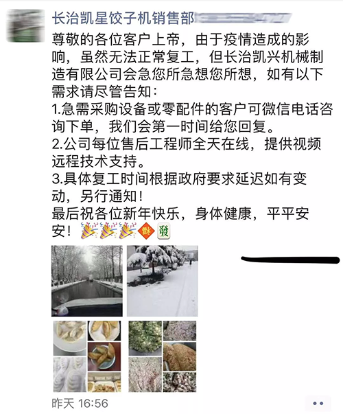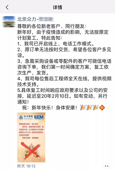 一些設(shè)備企業(yè)雖然暫時(shí)不能恢復(fù)生產(chǎn),但開始了線上辦公,紛紛發(fā)圈表示:公司技術(shù)人員、售后人員提供視頻遠(yuǎn)程技術(shù)支持,也是棒棒噠!