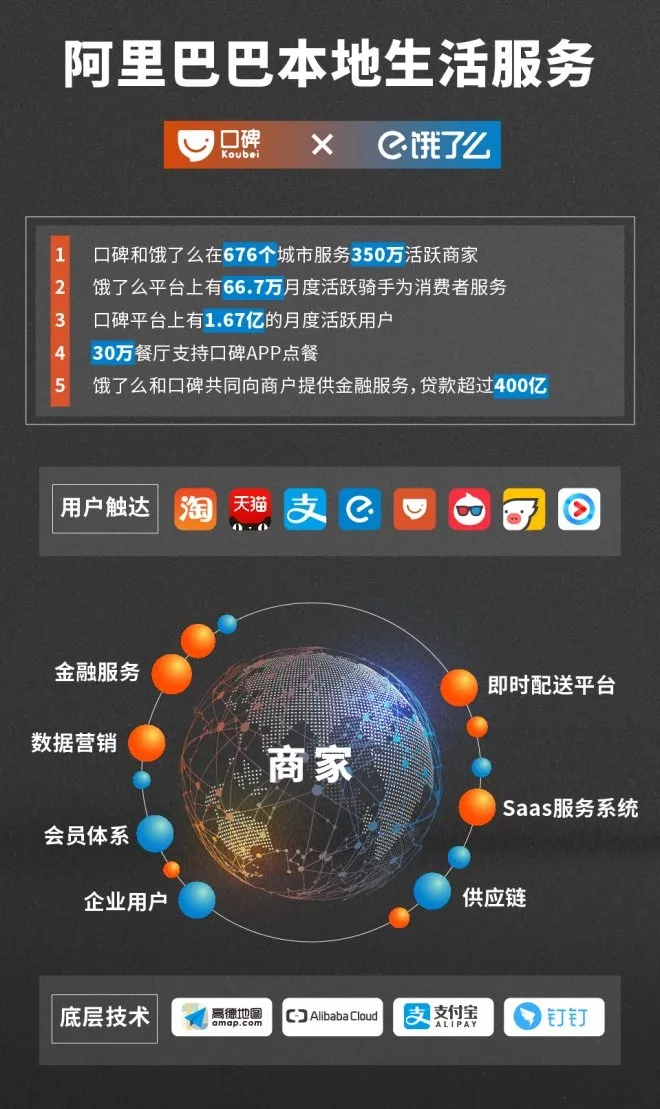 新成立的阿里本地生活服務(wù)公司是國(guó)內(nèi)領(lǐng)先的本地生活服務(wù)平臺(tái),口碑和餓了么一起在676個(gè)城市服務(wù)商家達(dá)到350萬(wàn)。在餓了么的平臺(tái)上,有66.7萬(wàn)的月度活躍騎手為消費(fèi)者服務(wù),平均每個(gè)用戶每年下單近20次;在口碑的平臺(tái)上,1.67億月度活躍用戶充分享受著完善的到店服務(wù)。