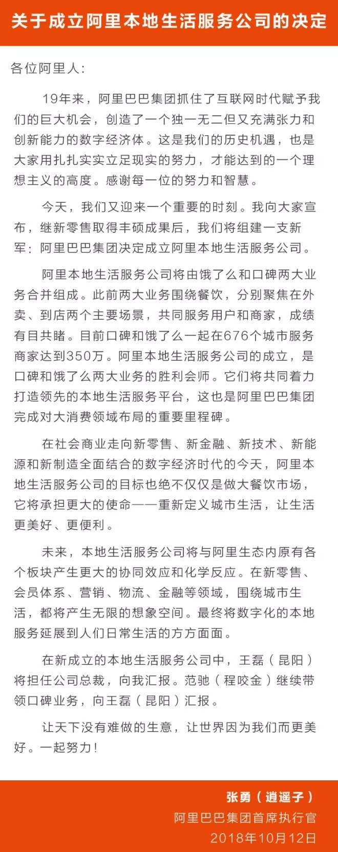 阿里CEO張勇在員工信中寫(xiě)道:“在社會(huì)商業(yè)走向新零售、新金融、新技術(shù)、新能源和新制造全面結(jié)合的數(shù)字經(jīng)濟(jì)時(shí)代的今天,阿里本地生活服務(wù)公司的目標(biāo)也絕不僅僅是做大餐飲市場(chǎng),它將承擔(dān)更大的使命——重新定義城市生活,讓生活更美好、更便利。”