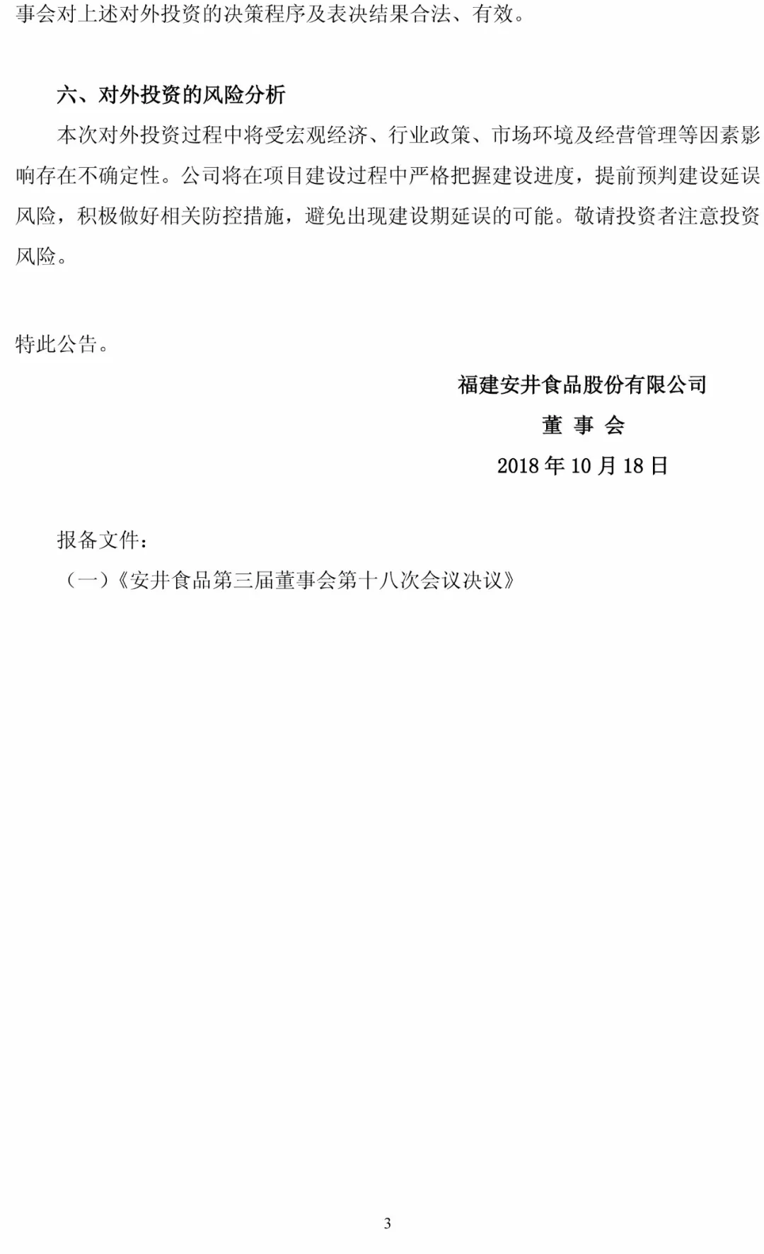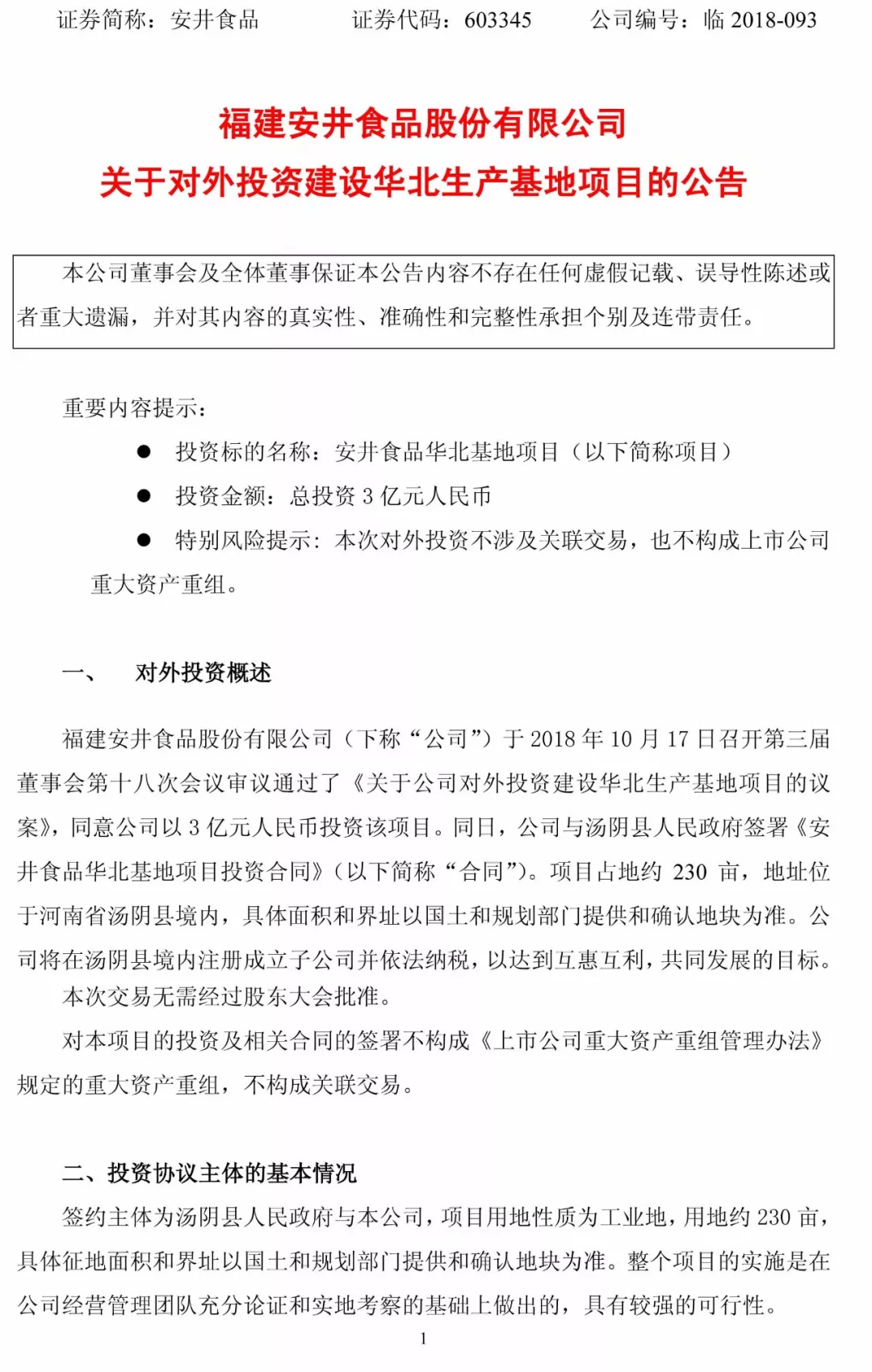 10月17日,安井食品召開第三屆董事會第十八次會議,審議通過了《關(guān)于公司對外投資建設(shè)華北生產(chǎn)基地項目的議案》,同意公司以3億元人民幣投資該項目。同日,公司與湯陰縣人民政府簽署《安井食品華北基地項目投資合同》。